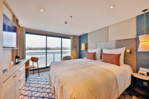 The VIVA TWO is the second new build from VIVA Cruises and, with 95 cabins, invites up to 190 passengers to enjoy moments of well-being on board. There are eight suites on the Diamond Deck, which are 24 m² in size and have a French balcony, inviting you to enjoy the beautiful view. On the Diamond Deck and the Ruby Deck there are 15 m² 2-bed cabins with a French balcony. On the Emerald Deck, the 2-bed cabins have windows that cannot be opened. All cabins are perfectly equipped with a flat-screen TV, included minibar, Nespresso® machine, beauty products from RITUALS®, hairdryer, safe, air conditioning, shower and WC and leave nothing to be desired.