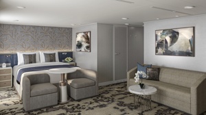 From the moment you first enter your Horizon Suite, you're struck by how light floods every corner, highlighting the exquisite designer touches, rich textiles and inviting colors. These opulent suites are meticulously crafted to maximize space and comfort, offering over 600 square feet from the entrance to the oversized veranda. As you move through the separate living and bedroom areas, you have the option to partition the space with a pocket door for added privacy. Your Horizon Suite also boasts a spacious walk-through closet with ample storage. Step outside to your private, oversized veranda, furnished with an outdoor dining table, a plush sofa and sun loungers.