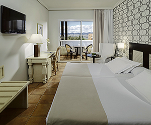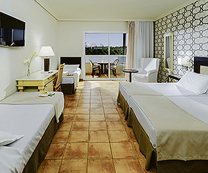 Standard rooms consist of either twin or double beds and an extra bed can be added for the 3rd person. Family rooms are larger than the standard rooms and can accommodate up to 3adults+ 1child or 2adults and 2children. All guests rooms are tastefully decorated and feature an ensuite bathroom with hair dryer,air-conditioning, satellite tv, a telephone, a hire safe and terrace or balcony.