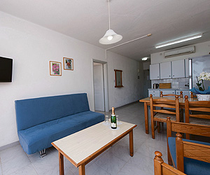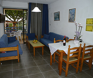 One bedroom apartments sleep a max of 2 adults and 2 children. One-bedroom apartments include twin beds with private bathroom, dining table , coffee table with armchairs or sofa, kitchenette, fridge, tea & coffee making facilities, air-conditioning*,bedroom and living room, telephone ,TV, safe* and balcony/terrace with a table and chairs.