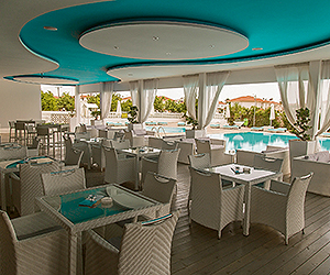 Outdoor pool • children's pool • terrace • garden • Dionysos bar • pool bar • restaurant • basketball court • gym • tennis court • gift shop • Free WIFI in public areas • * = local cost
