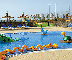 2 swimming pools, one acclimatised (winter only) with jacuzzi & a children's pool playground mini club & disco (4-12 years) half board buffet restaurant bars animation programme multi sports courts games room* gym courtesy bus to resort centre & Fuerteventura golf course free wifi * = local charge.