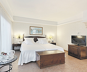Air conditioned double rooms sleep 2 adults with flat screen TV, telephone, mini bar*, wifi in rooms, safety deposit box* and furnished balcony. Bathroom with bath/shower and hairdryer. Pool or side sea view rooms sleep 2 and are available with supplements Deluxe room with supplement sleep 3 and are larger rooms (45m2) with extras including welcome minibar with free water and soft drinks, bathrobe, slippers & unlimited spa entrance. The Deluxe room with hot tub either inside the room or on the balcony has the same extras as above with extra supplement.