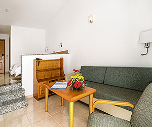Split level studios sleep 3 adults or 2 adults and 1 child with twin beds and sofa bed, TV*, telephone, safety deposit box* and kitchen area with two ring hob, fridge, kettle, toaster, balcony or terrace. Bathroom with bath/shower. Air conditioning is on request with local charge and can only be confirmed on arrival.