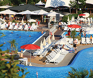 Reception 5 swimming pools with several slides sun loungers sun terrace 3 restaurants bars TV room games room ice cream shop supermarket souvenir shop playgrounds tennis basketball football table tennis volleyball & beach volleyball courts archery bike hire internet point parasailing animation programme miniclub playground aqua gym surfing canoeing evening entertainment -games, spectacles and cabaret bicycle hire laundry safety deposit boxes free parking WIFI* *= local costA daily tourist tax is payable locally. Check in is after 5pm. Swimming pool available for use before check in time.It is recommended on the day of arrival to bring a separate small bag with a change of clothes & swimming clothes to relax by the pool while waiting to check in.