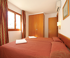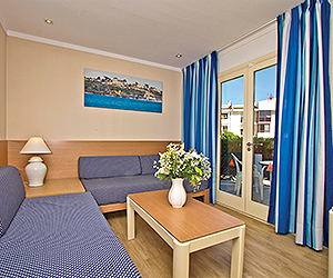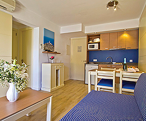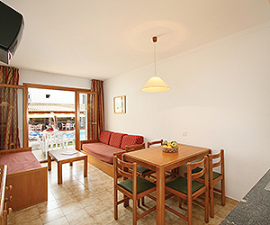 One bedroom apartments will sleep maximum 4 adults or 2 adults and 2 children with twin bedroom, lounge with two single sofa beds. Bathroom with bath with shower, hairdryer. Kitchenette in the lounge area with a fridge, mmicrowave, two ring hob and a kettle. All apartments have tv, telephone, safety deposit boxes*, balcony or terrace.