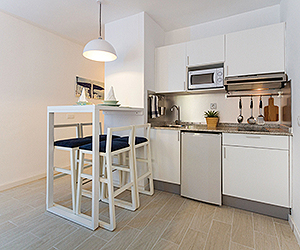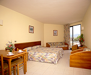 Studios will sleep maximum 4 adults or 3 adults and 1 child or 2 adults and 2 children. All studios have lounge/sleeping area with twin beds, sofa bed/pull out bed, kitchenette with hob, toaster, fridge, microwave, bathroom, safety box*, air conditioning, balcony or terrace., flat screen TV*, wifi*, balcony or terrace.