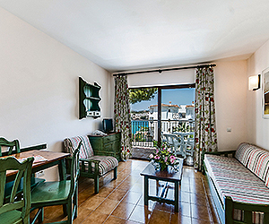 One bedroom apartment will sleep maximum 4 persons or 2 adults and 2 children Some one bedroomed apartments have pool view with supplement. All apartments have air conditioning, bathroom, hairdryer on request,, kitchenette with microwave, fridge, tv, telephone, balcony.Facts Board basis: Self catering. Cleaning, towel and linen change: available. Number of apartments: 74. Number of floors: 3 and 4 storey. Official rating: 2 key. Child age: under 16 years on self catering basis. * = Local charge.