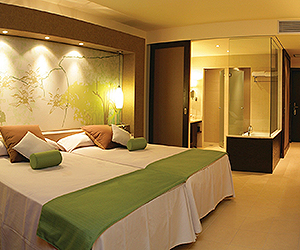 Air conditioned Deluxe Double rooms sleep 3 adults or 2 adults & 1 child with pull out sofa bed with mini bar(stocked on request*), TV, safety box, bathrobe, coffee/tea making facilities (on request*) with balcony or terrace. Bathroom with bath & shower. Deluxe Double sea view and Junior Suites with supplements. Cots on request.