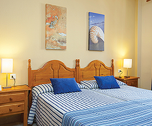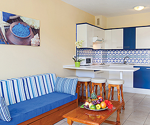 Studios sleep 2 adults. 1 bed apartments on a Self Catering basis sleep 4 adults with a double sofa bed in the living area. 2 bed apartments sleep 6 adults. All rooms have a kitchenette, fridge, coffee maker, telephone, wifi*, safe*, TV and a balcony/terrace. Bathroom with bath/shower. All rooms on an All Inclusive basis are without a Kitchenette.